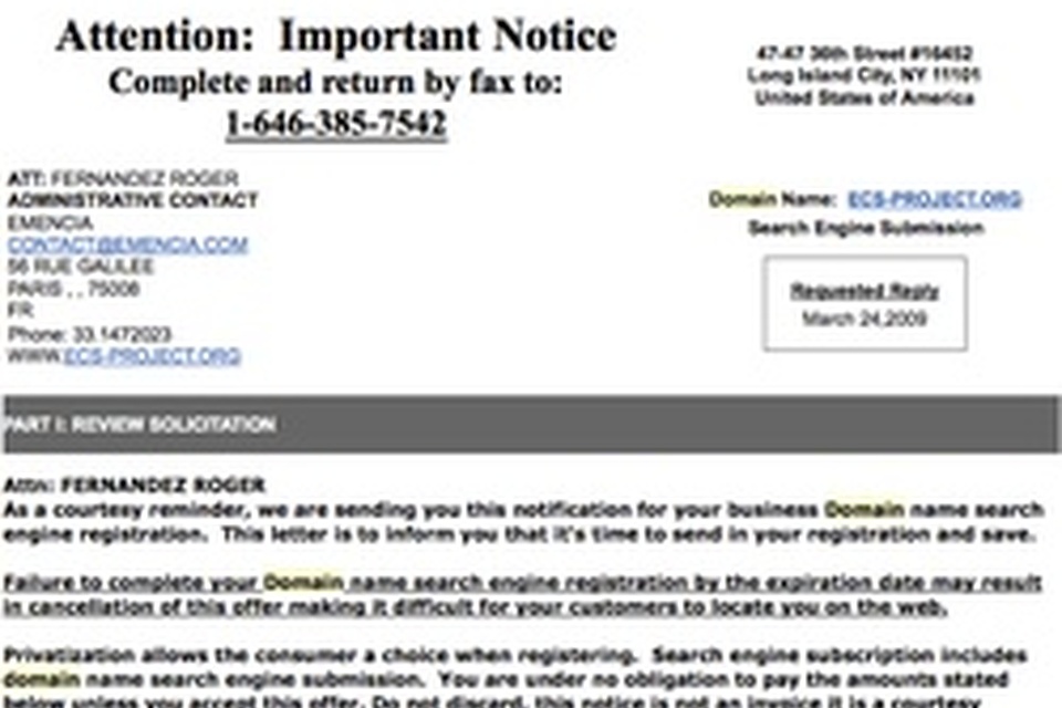 Cette société propose aux propriétaires de renouveler leurs noms de domaines ou d'en acheter de nouveaux. N'en tenez pas compte : c'est une fausse offre qui n'a rien à voir avec votre site.