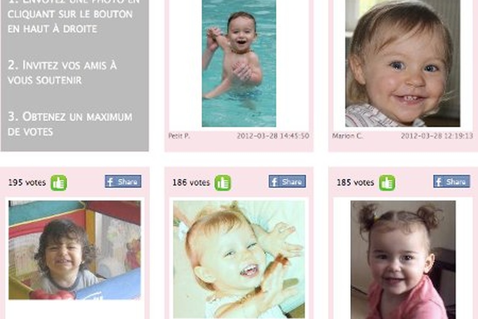 Voici la vue présentant les photos. Elle permet d'envoyer une photo pour participer, de voter et de partager auprès de ses amis pour glaner des votes supplémentaires.