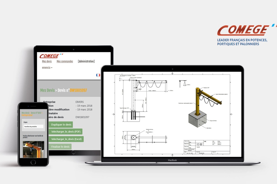 Emencia a été en charge de reprendre le développement d'un configurateur en ligne d'appareils de levage ( Potences à rotation totale, Potences murales, Potences sur fût, Portiques), une application qui permet de générer des devis en ligne et les plans des appareils.