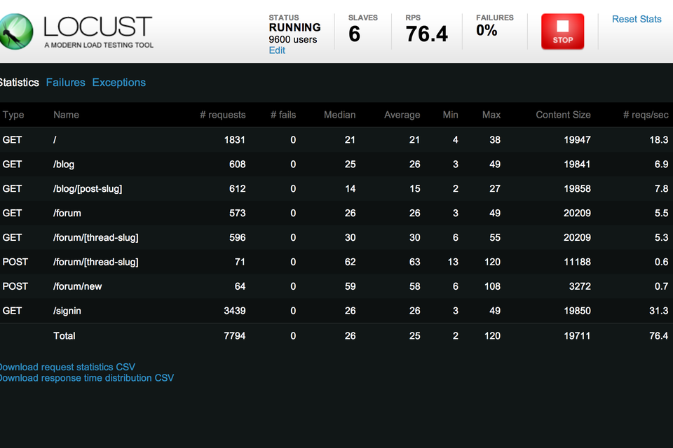Locust propose une interface web, permettant de lancer ces tests et obtenir des résultats graphiques (exportables en CSV)